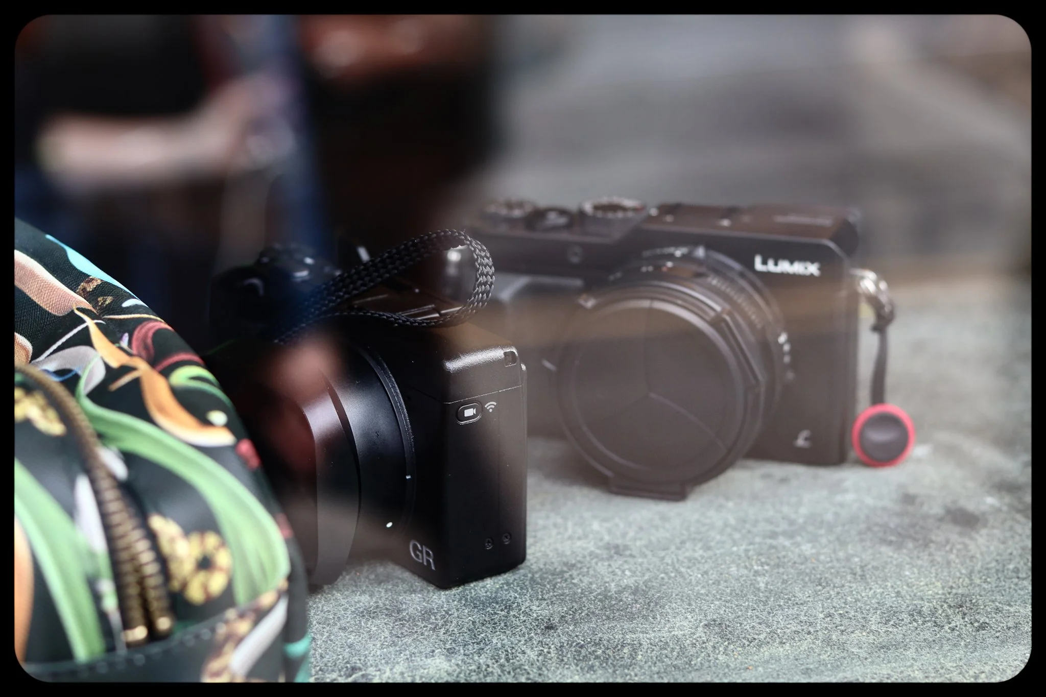 Tools of the Trade - Two compact cameras resting on a table, reflected through glass.